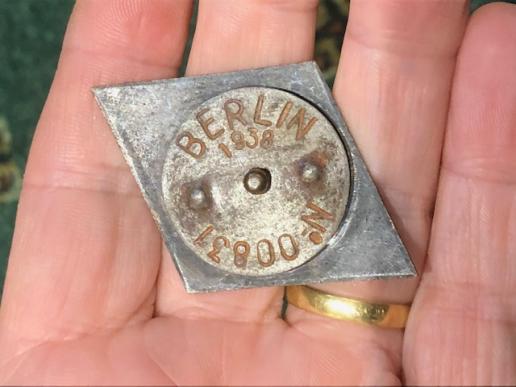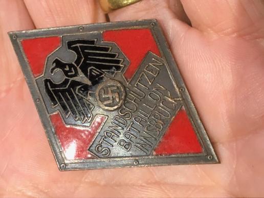 Standschuetzen were the traditional shooting guilds/clubs that existed in Austria, and apparently towards the end of WWII their members were formed into home defence units rather like the Volkssturm. Each battalion would have had a badge to show the region it came from [hence Innsbruck] This is quite a large enamel diamond shaped badge with a solid screw back fixing. Has the Austrian Third Reich eagle in the middle with Standschuetzen Batallion Innsbruck underneath. Red and black enamels. Reverse has screw back fitting with a disc marked Berlin 1938 and numbered 00831. Interesting and unusual badge.