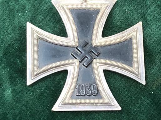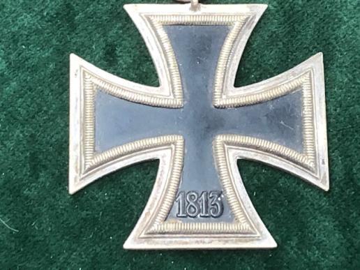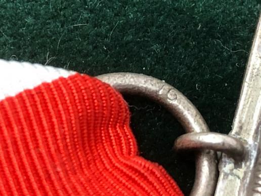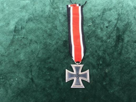 An EKII in nice uncleaned condition, complete with original full length ribbon. Silver frame darkened with age and patina. Black steel centre has all the original paint. Suspension ring is stamped with a very small '6' which is for the maker Fritz Zimmermann, Stuttgart. Nice , original iron cross. One for the maker mark collectors out there.