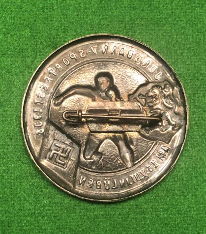 Pin back tinny commemorating an HJ Sports Festival in Luben in 1936. Good, clean condition. POSTFREE within UK