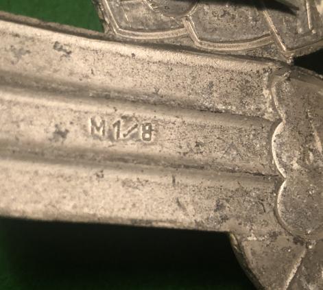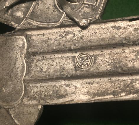 Alloy, second pattern NSKK crash helmet National Emblem. RZM and manufacturer marked M1/8 to reverse with all retaining pins intact. The whole emblem has been blackened and retains much of the original black painted banner and eagle surround. Good overall condition and uncommon.