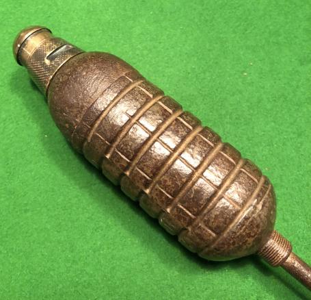 A good example of a WW1 German Model 1913 Rifle Grenade. Cast body with segmented fragmentation pattern with screw in brass percussion fuze. Original rod retaining protective cap with approx. 50% of the original paint finish. Fully strippable.