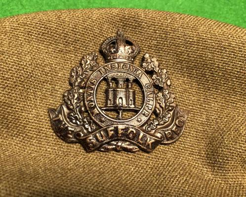 High quality WW2 British Officers' beret for an officer of the Suffolk Regiment. Manufactured by ' Burberrys ' with a prominent label to the lined interior covered by a, now ripped, protector. Fine quality serge body with lined interior with a tooled leather sweatband. A bronzed, two-bladed officers' Suffolk Regiment badge to centre. Approx size 7. Excellent, used condition with one small, 2mm snag to crown.