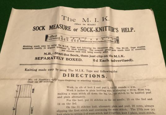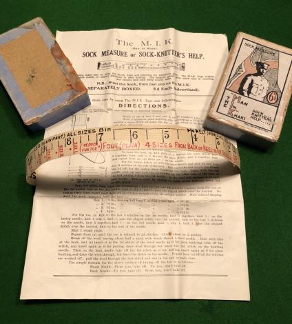 Charming early WW1 offering, a boxed ' Man in Khaki ' sock measure. Complete with instruction sheet the ' M.I.K.' measure allowed those knitting comforts to produce uniform size socks in four sizes, particularly ' amateurs ' . In excellent condition with some rubbing and denting to box.
