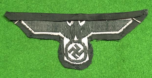 German M39 O/R's Breast Eagle. Silver grey cotton eagle on emerald green, rayon backing, using the classic Bevo weave. Unused, but cut to shape.