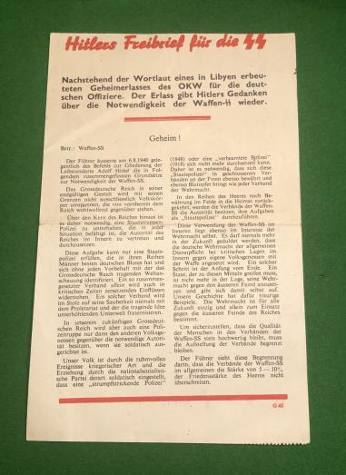 Produced by the PWE in 1942 numbered G.43 and titled "Ein solcher Verband wird im Stolz… " featuring a pair of loathsome looking SS officers. Playing on Hitler's charter for the SS and dropped by balloon and aircraft between August and October 1942. In good, clean condition.