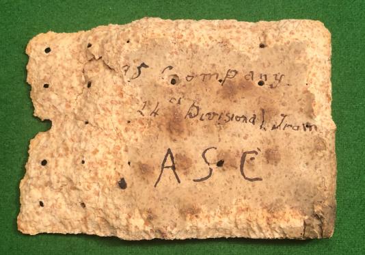 An example of a British WW1 hard tack biscuit used as a souvenir. To one side, written in ink is the inscription ' Weat and Woking Surrey 24.8.15 ' and to the other side ?95 Company 24th Divisional Train ASC '. The 195 Co. 24th Div. Train ASC went on to serve later in 1915 at Plugstreet and St.Eloi during the Battle of Messines. The biscuit is substantially intact to one side but has flaked to the other side but retains the majority of the inscription. Unusual.