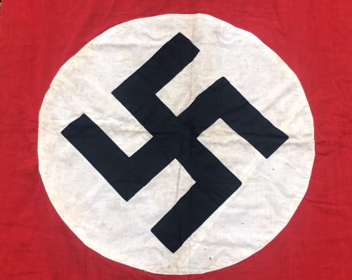 Multi-piece construction, cotton NSDAP, double sided drape or flag. Sown sleeve to one end to allow a pole to be passed through to allow vertical hanging . Approx 175cms x 69cms and in good, used condition with some light marking but no damage.