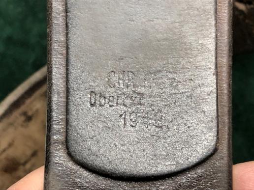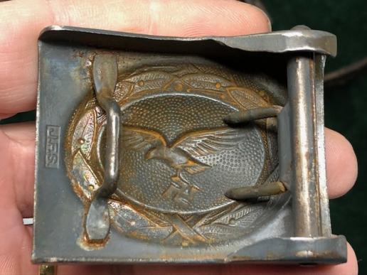 A really good example of a war time used and dates Luftwaffe combat belt and buckle. The buckle is in excellent condition and retains most of the original BLUE finish to the metal-rare to find! A one piece machine stamped piece with clear markings from the JFS company on the inside lip. Belt is black leather and retains the adjustment tongue. Belt has a makers stamp and is dates 194?, with the last number somewhat indistinct. Leather in excellent shape, supple with no tears or damage.