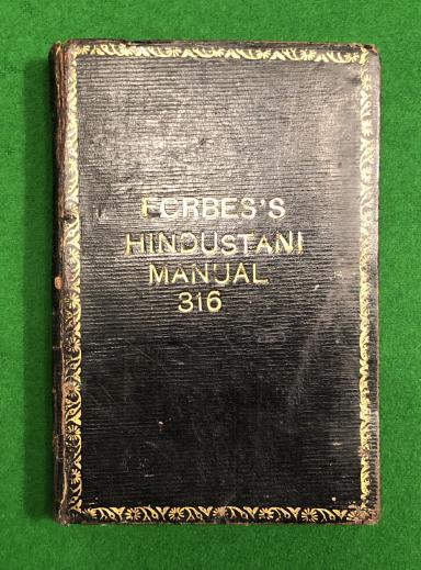Leather bound ' Forbes's Hindustani Manual ' with a poignant inscription from the mother of Major Norman Macleod Adam killed in action 28/08/18. The manual was given to Adam by his mother in 1911 on joining the RFA and being posted to India, it was returned to her along with the rest of his kit when he was KIA commanding 19th Battery RFA in France. This story is written in pencil by his mother to the inside cover of the manual. Adam was the son of Maj.Gen.F.A.Adam. Unusual and poignant.