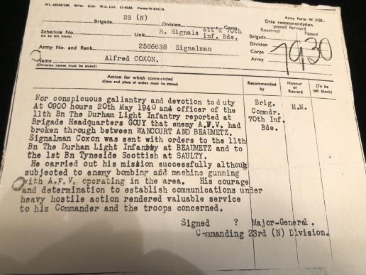 For conspicuous gallantry and devotion to duty. At 0900 hours on 20 May 1940, an officer of the 11th Battalion, Durham Light Infantry, reported at Brigade Headquarters Gouy that enemy A.F.V. had broken through between Wancourt and Beaumetz. Signalman Coxon was sent with orders to the 11th Battalion, Durham Light Infantry at Beaumetz and to the 1st Battalion, Tyneside Scottish at Saulty. He carried out his mission successfully although with A.F.V. operating in the area. His courage and determination to establish communications under heavy hostile action rendered valuable service to his commander and the troops concerned.’