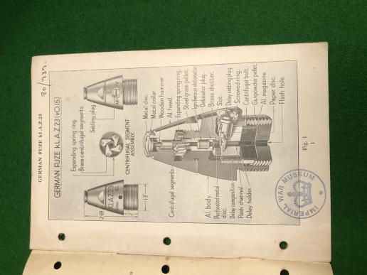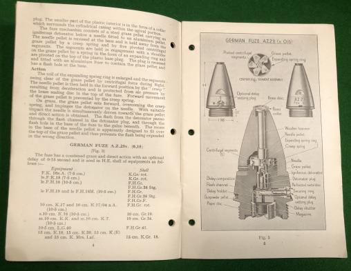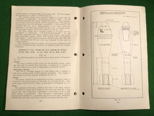 1944ed. ' Handbook of Enemy Ammunition - Pamphlet No.12 - German Gun and Mortar Ammunition. ' 39pg scarce manual, detailing the available information on German gun & mortar ammunition concentrating primarily on fuzes, primers etc.. Profusely illustrated with sketches, b/w photographs and diagrams. Good, used condition with marking to covers. Ex-lib IWM.