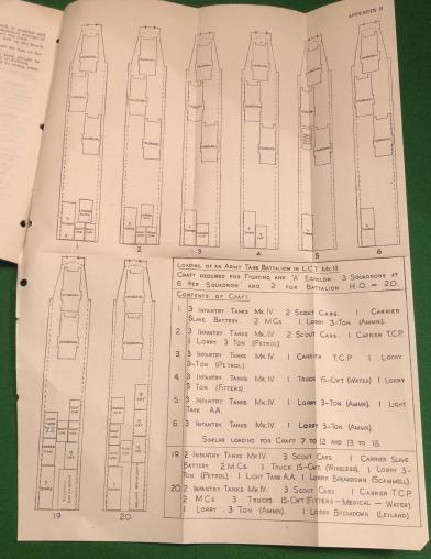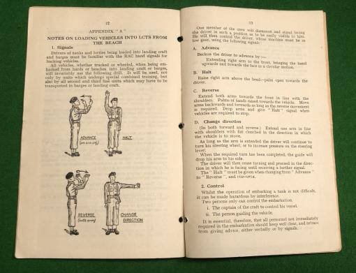1943 Combined Operations Pamphlet No.33 ' Armoured Fighting Vehicles '. 14pgs outlining the deployment of armour in Combined Ops with illustrated appendices and pull-out chart showing loading schemes for LCTs. Good, clean condition with some rusting of staples and staining.