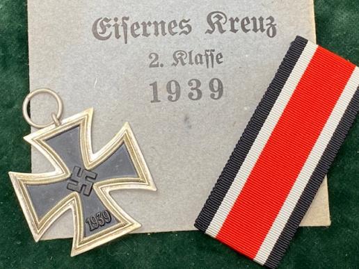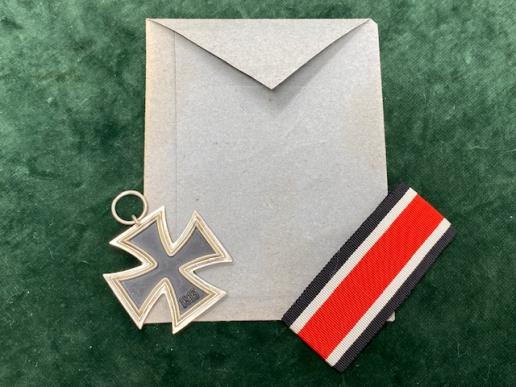 There have been many of these found over the years as ‘new, old stock’. There were millions made and issued during and before the war. However, they have mostly disappeared and dried up, all going into collections all over the world. This is a mint, unissued Iron Cross second class. There IS a ring maker stamp, but I can't read it, perhaps 14? Condition is mint, with a little age tarnish patina. The original long piece of ribbon is with it and both are inside the original blue paper issue packet. Packet is fine with no damage, tears etc. It’s faded a little at the edges when stored. Other than that, everything is in beautiful condition.