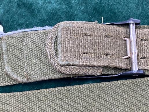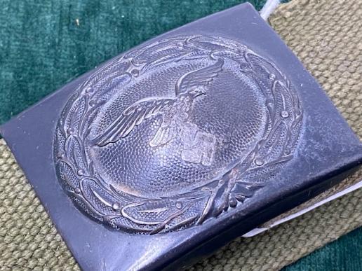 A very nice example of the ‘blues’ Luftwaffe combat buckle with the correct green webbing/canvas tropical belt. A very nice combination. Buckle has virtually all of the original blue finish, slightly worn in the swastika area. As far as I can see there are no makers marks to the reverse. Tropical green canvas belt is complete with the belt adjusting tab sewn to the inside. Nice combination and Afrika Corps or tropical kit is in great demand. I tried to buy a similar belt etc at a recent auction. It made over £300 plus commission!