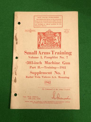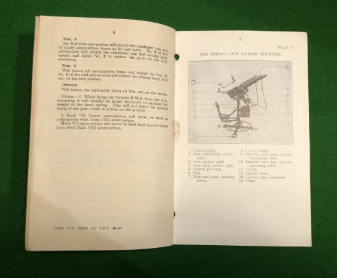 S.A.T. Vol I, Pamphlet No.7 .303-inch Machine Gun Pt.II Supp - Radial Twin Vickers A.A. Mounting 1942. 15pg manual demonstrating the uncommon twin Vickers for mounting in the rear of a 15cwt. truck for AA use. Illustrated with b/w photographs. Good condition with rusting of staples.Uncommon.