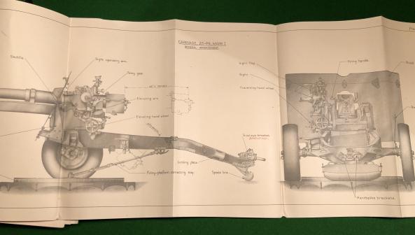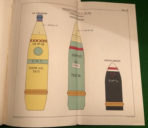 Handbook for the Ordnance, Q.F. 25-PR., Mark II on Carriage, 25-PR., Mark I Land Service 1940. 277pgs complete with all amendments tipped in with fold out plates, sketches and diagrams covering all aspects of the operation, including ammunition, of the 25 Pounder, the standard medium artillery piece used by the British through out the War. Good, used condition with all plates, grubby covers with a small amount of rodent damage to edge but all contents present and clean with some annotations.