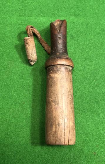 Unusual mid-19th century ' apostle ' style ammunition pouch probably of middle eastern origin although similar Indian examples are known. Consisting of a well made leather bandoleer containing 7 turned wooden containers with spouts, these spouts are plugged with material with leather lanyards ( some now detached ). These wooden containers would have contained pre-made charges of black powder to allow for rapid loading of the muzzle loaders then in use. The reverse of the pouch has a sleeve attached to allow for use on a belt or bandoleer. Good, used condition and unusual.