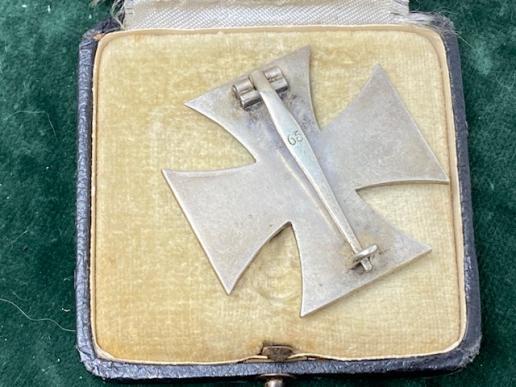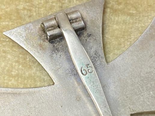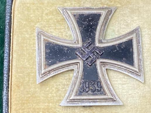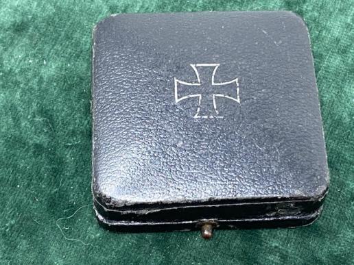 Always nice to get a nice ‘used’ Iron Cross and this 1st Class example is in very good condition, but you can see it’s been worn and used. Cross has all original black paint but with some surface ‘bumps and thumps’ from wear and use. Reverse has the original pin and hook. Pin is stamped with makers number ‘65’ which is for the Klein and Quenzer AG of Idar/Oberstein. An identical cross to this, in the case, is shown on the Wehrmacht Awards Iron Cross page. Case is black covered with silver outline of EK1 on the lid. Cream flock material is the backing bed for the medal. The inside lid is white rayon silk. Hinge is intact and working. A good ORIGINAL example.