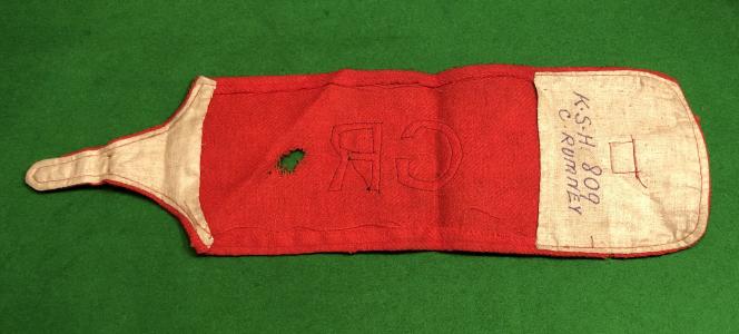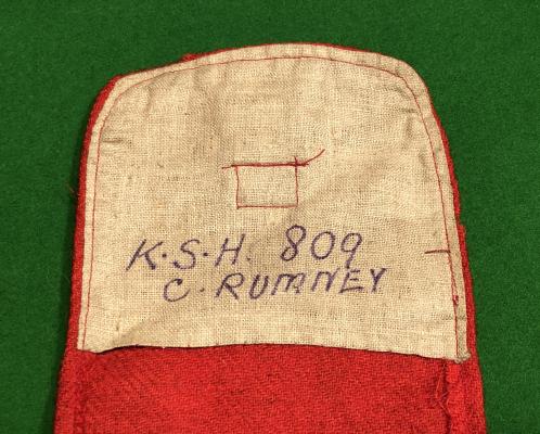 Rough wool armband with applied letters ' G R '. These armbands were worn by members of the Volunteer Training Corps and other early Volunteer Force units. Partially lined and named ' C.Rumney K.S.H. 809 '. Generally good condition with a 10mm x 20mm tear and slight rusting to buckle. Uncommon.