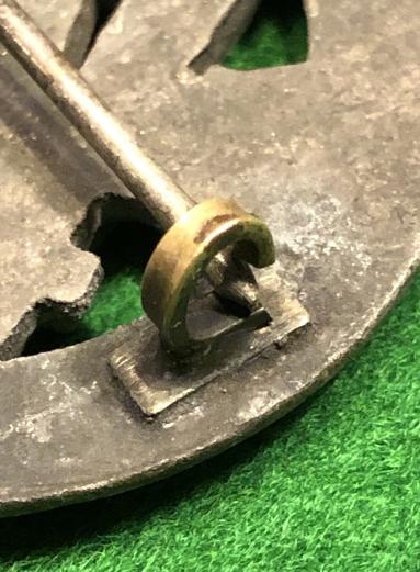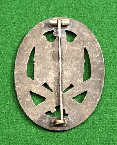 Original die struck, zinc General Assault badge. Non magnetic hinge, pin and flat wire catch. No maker's marks, flat reverse. Good detail to wreath and eagle with approx 85% original silvered finish remaining, although dulled with wear to high points and a small area of oxidisation.