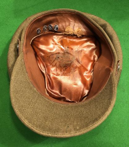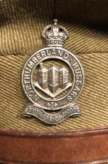 A good example of a cap worn by an officer of the Northumberland Hussars. Kings crown silvered Northumberland Hussars badge with similarly made buttons befitting of a Yeomanry regiment. Serge body with lining and full leather headband and complete liner protector under which the manufacturer's details of Herbert Johnson of New Bond St can be made out. Metal initial plates ' J.H.N.P. ' have been attached to the headband with further evidence of the original owner being the name ' Porter ' inked to the reverse of the headband. In excellent, clean, moth free condition with some light staining to the top of the cap.