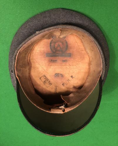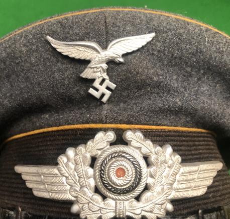 Woollen body with three areas of damage to the crown, largely undamaged yellow piping with a vulcan fibre peak with green underside. Small area of peak seam missing which is not visible when displayed. Aluminium wreath surmounted by a second pattern eagle. Good, honest cap.