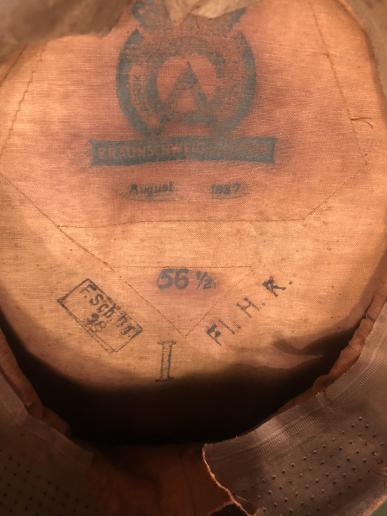 WW2 Luftwaffe O/R's and NCO's visor cap piped in yellow for flight branch. Size marked 56 and dated 1937 with now indistinct maker's trademark present to the interior in the diamond left by the missing celluloid protector. Two separate unit markings are present, one to a flying school and another for the Flieger Horst Kompanie. Leather headband has an area of damage with a section missing but otherwise present and firm