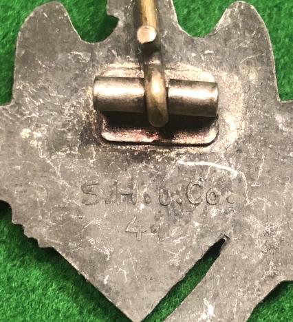 A good example of a manufacturer marked silver Infantry Assault badge. Zinc construction marked ' S.H.u.Co.41 ' to the reverse in raised letters under the hinge, the mark of Sohni, Heubach and Co.,Idar Oberstein. Residual silver wash to some areas but mostly base zinc finish to the majority of the badge. Good, original badge.