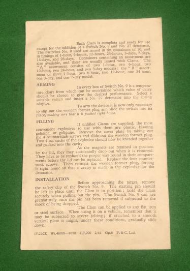 1944 dated instructional leaflet for the British ' Bomb Clam MkIII - Description and Method of Use '. Three page leaflet with cut-away diagram that was included with the packaging of the mines. Excellent, clean condition and scarce.