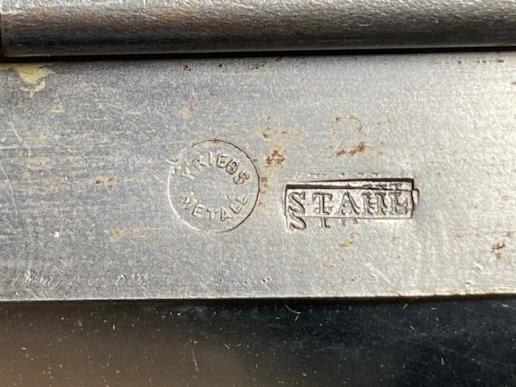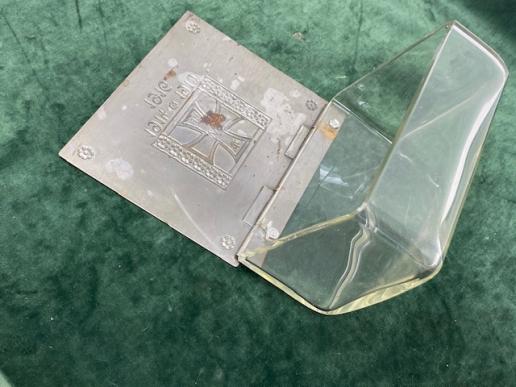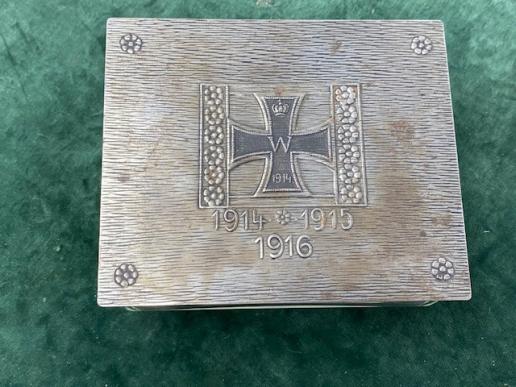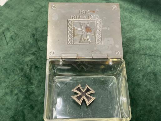 Made of a thick glass base, with a metal hinged lid. This little box or case is approximately 8"x6" and 4" high. The beautifully crafted lid is in steel with a 'wavy' effect to the surface background. There is a flower embossed into each corner. The centre design is a beautifully embossed Imperial German Iron Cross 1st Class 1914. Below the cross are the dates 1914-1915-1916. This is not trench are, but has been commercially made. Along the rear hinge is stamped 'stahl' (steel) and then beside it in a circular stamp 'KRIEGS METALL' (war metal). So if this was made from steel salvage from the war, or steel from the time, I am not sure. However, a great period piece and a nice display item. Perhaps you could story your Iron Cross collection inside? (there is one pictured inside just to show a size comparison, is not included!)