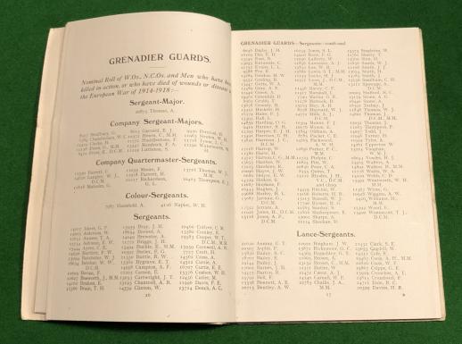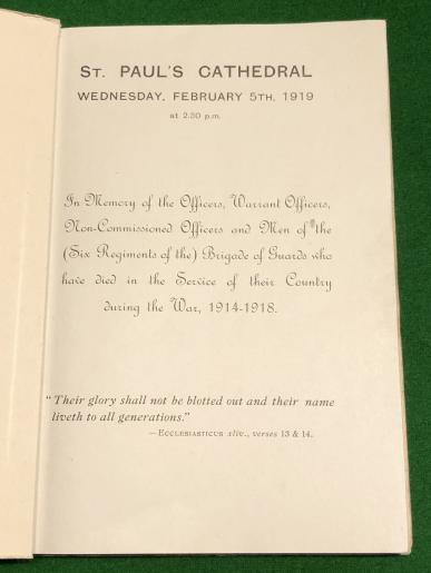 1919 Order of Service for the Memorial Service for the Brigade of Guards that was staged in St.Paul's Cathedral in February 1919. The majority of the card covered booklet is given up to rolls of casualties of all the units making up the Brigade including the Guards Machine Gun Regiment. Good condition with some marking and bruising to card covers.