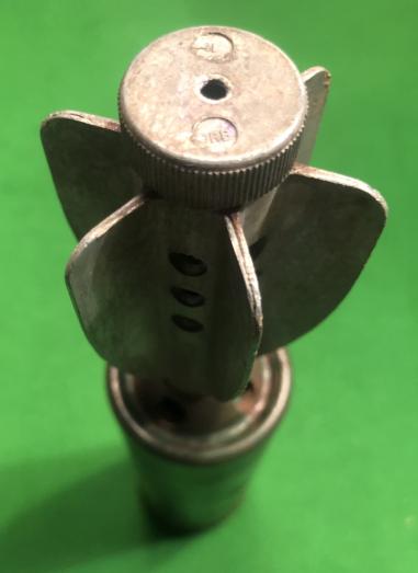 1943 dated, British 2" Mortar Smoke round. Fitted with a 1943 dated tail fin and retaining 85% of it's original markings unusual for a discharged smoke round.Manufacturer's markings to body and tail and fuze. Excellent example, partially strippable.