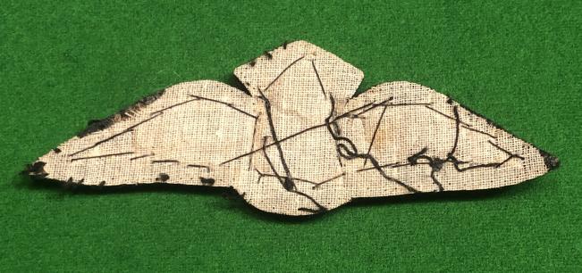 A good example of an embroidered WW2 RAF pilots' brevet. Featuring creamy coloured feathers and crown with the top part of the wing in relief . Cloth backed . Evidence of having been removed from a tunic but in excellent, used condition.