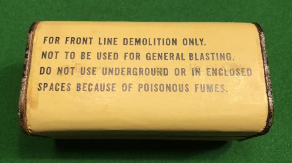 Standard US wartime block of High Explosive TNT. On general issue to engineers, special forces and the resistance this example is a 1/2lb block with a cap threaded to accommodate US forces' fuzes, delays etc. Taken from an original case of 100 similar charges and in good, clean condition with some corrosion to end caps, clean labelling. Several available, priced individually.