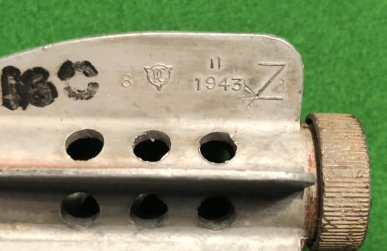 1942 dated, filled in 1970 British 2" HE Mortar round. Fitted with a 1943 dated tail fin and retaining 95%+ of it's original lacquer and markings. Manufacturer's markings to body and tail and fuze. Unusual example showing the round had been refilled in 1970 during the last employment of the mortar Excellent example fitted with a transit plug. Strippable.