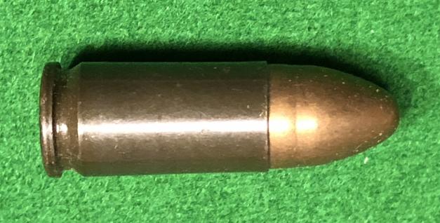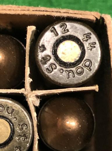 Original, 1944 dated, box of 16 x 9mm Pistolpatronen 08 ammunition. Lacquered steel cased rounds dated 1944 manufactured by Waffenwerke Bruenn AG, Werk Bystrica whose ' dou ' code is seen as a head stamp. Label giving manufacturer's details etc present but torn to enable opening of the box. Good, clean condition.