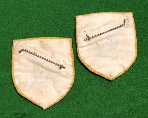 Embroidered cloth formation signs for the 82nd West African Division. Dispatched to India 1944. Served in SEAC as part of the Fourteenth Army. Joined the 81st West African Division in the assault on Myohaung and the advance through Burma. Attractive examples backed with cotton to allow large pins to be mounted for easy removal . Excellent, used condition.