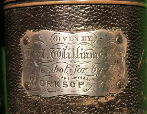 A pair of early binoculars given as a shooting prize by T.M.Williams of the Worksop Rifle Volunteers. They were subsequently won by Col.Sgt.L.W.Latham of the 7th Notts Rifle Volunteers on 01/10/1863. This information is given on two silver escutcheons screwed to the extendable sun shields. Binoculars in good, used condition with leather intact and optics functioning.