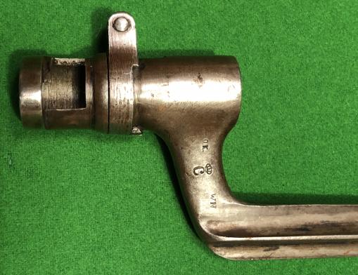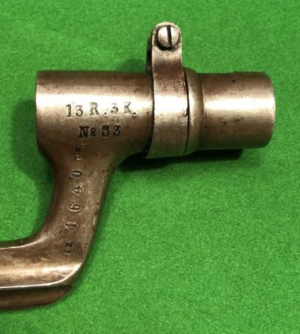 Swedish M1867 Socket Bayonet For The 12.17mm Remington rolling block rifle. Featuring a 50cm cruciform blade attached to a socket with a central locking ring. The shoulder is stamped with the Swedish Crown over ' C ' with initials ' O.K. ' and ' W.N.' with the other side carrying the initials of ' H.M. ' and ' P.S. ' with the number ' 1640 '. There is also a regimental mark of ' 13R 3K ' and ' No 53 '. Good, clean condition.