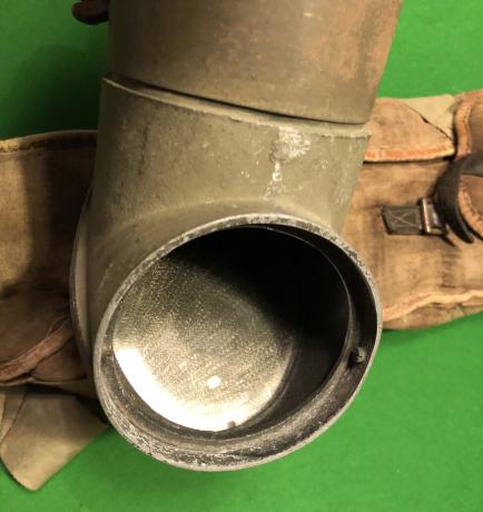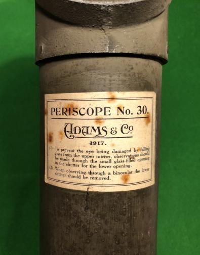 Trench periscope by Adams & Co with ' mirror covers & mounting spike cylindrical periscope body with cast aluminium ends housing mirrors. Mirrors covered by removable shutters held on retaining string. Mounting spike attached to clamp located round body above lower mirror housing ', all contained in the original canvas and hessian carrying bag. In excellent condition featuring 95%+ of it's original khaki painted finish with full instructional label varnished onto body. Black printed WD broad arrows to body of periscope and carrying bag. Some very minor corrosion and fraying to carrying bag but an otherwise excellent example.
