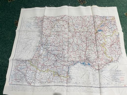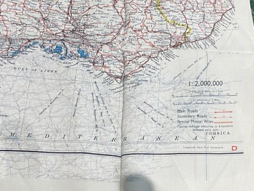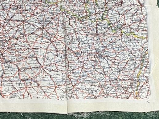 Mid-War double sided silk escape map for use primarily by the RAF. 52cms x 44cms size, multi-coloured this example is coded ' C ' and ' D ' and primarily shows France, Belgium, Luxembourg and Holland. Excellent, clean condition, folded