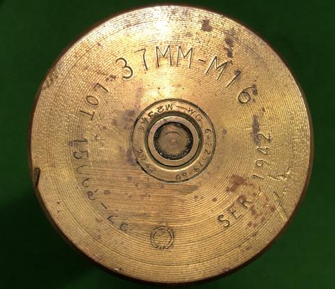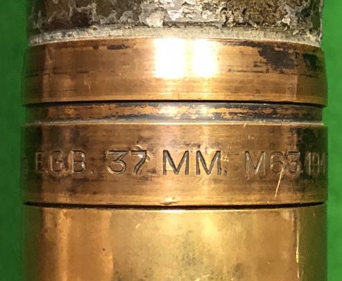 1942 dated, US 37mm M63 HE round. Initiated by a base fuze, this round was intended for use in the M3 A/T gun and the same calibre gun used in various US armoured vehicles. Projectile and case 1942 dated with various manufacturer and inspection marks. Good overall condition with some very minor pitting of projectile but 80%+ original paint remaining.