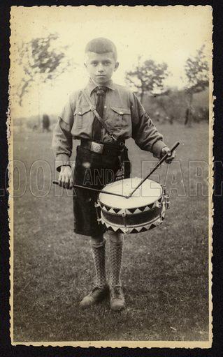 This is the smaller side drum carried and used by HJ or DJ boys. I have shown period pictures of them carrying this exact type of drum. Painted wood with brass sides. Painted in the normal red diamond pattern on a white background. The crescent shaped leg brace is present. Bottom skin is intact, but the top skin is split on one side. However, it still plays well as the rest of the skin is taught. Paintwork in pretty good condition. All adjusting mechanism present. It is even complete with a pair of original drum sticks! Drum measures 18” across and 5” deep. A great little 100% period drum to go with a HJ collection.