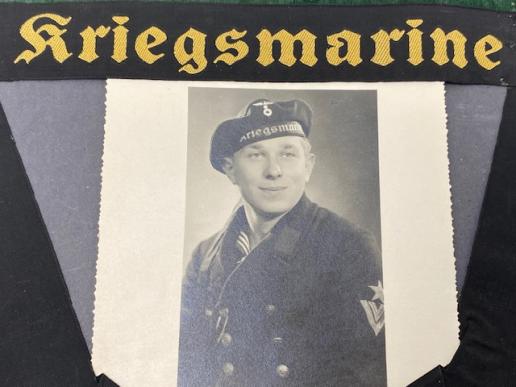 This is great original WW2 Third Reich naval cap tally period mounted with an original photograph of the very youthful looking sailor. This seems to have been removed from a period frame. Cap tally is mounted on card and ‘frames’ the photograph itself. Lovely original period photo in black and white. Is signed in pencil in bottom right corner. Sailor is in full uniform and is wearing his ‘Donald duck’ navy cap with the ‘Kriegsmarine’ tally fully displayed. This montage was obviously done by his family and would have been pride of place in the home somewhere. A great combination which will be perfect to add to a naval collection. In really good condition.