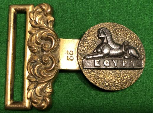 A silver and gilt post 1881 example with a silver circlet inscribed ' Gloucestershire Regiment ' and a seeded gilt centre mounted with a silver sphinx surmounting a tablet enclosing ' Eygpt '. Universal pattern rococo numbered mounts. Minor service wear, patinated overall.