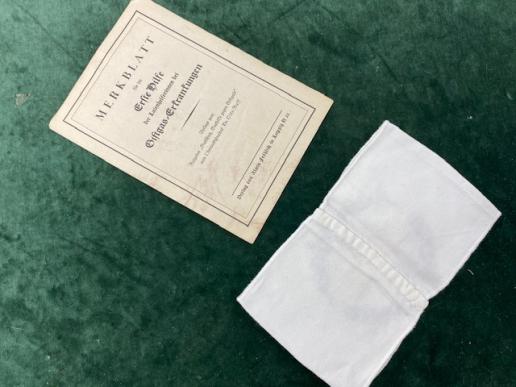 This is a mint conditioned Red Cross armband in white cotton with the Red Cross emblem and black writing embroidered into the fabric. Armband looks to have never been worn. These were worn by all military nurses etc. Many pictures of them being worn on the left sleeve. It came with a period pamphlet for the supply of medical items to the Red Cross from a period company. Very interesting looking at all the items, along with their prices in Reichsmarks etc. These two items came together.