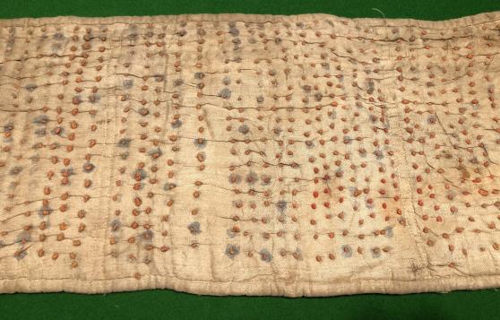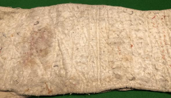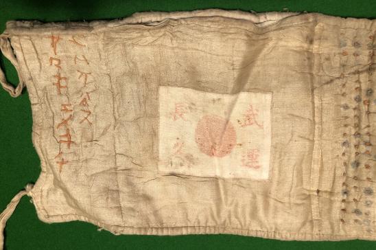 Cotton Japanese Senninbari or one thousand stitch belt. The belt was worn around the waist under the shirt or uniform as a good luck charm. The symbolic 1000 stitches are hand-stitched with some being circled in ink. The belt is lined with wool and bears clear evidence of having been worn. To one side is an enclosed pocket which would have probably contained temple offerings or good luck symbols onto which a separate printed japanese flag has been applied. To the side are some stitched characters, probably the name of the original owner. Good, heavily used condition with all ties intact.