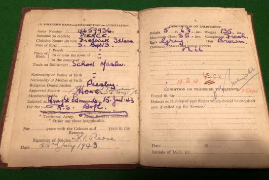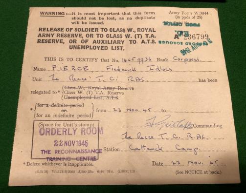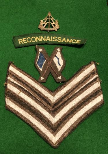 WW2 Reconnaissance Corps grouping to 14659936 Cpl.F.Pierce consisting of paybook, Transfer to Reserve certificate, Reconnaissance Corps cap badge, Corporal rank stripes with crossed flags signaller's qualification and a Reconnaissance, glueback shoulder title. Pierce qualified as a driver operator in summer 1944 with further wireless instruction and presumably was part of an armoured car crew with which the corps was equipped. All items in good, used condition.