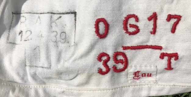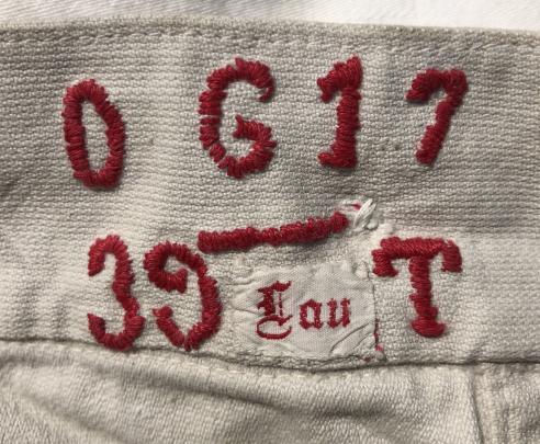 Cotton drill Kriegsmarine shirt and trousers to be worn by enlisted men during the summer months. Both items bear matching name tapes and stitched identification details of a seaman ' Lau ' with the shirt having stamped issue marks showing issue from the Kiel depot in 1939. Shirt has a BeVo national emblem to the right breast with gilded alloy buttons to the cuffs. All button and tapes are present with both items being in excellent, used condition with an area of light staining to right shoulder.