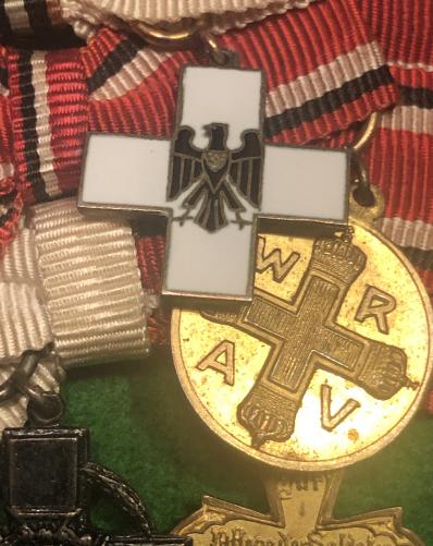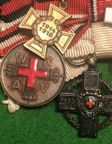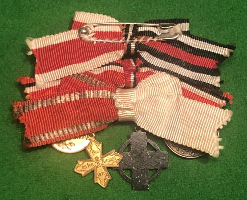 Attractive miniature grouping on bow fittings indicating continued service with the Red Cross with Imperial forces into the period of the Third Reich. All decorations in excellent clean condition with undamaged enamel to the Red Cross Honour badge and intact lacquer to the Hindenberg Cross.